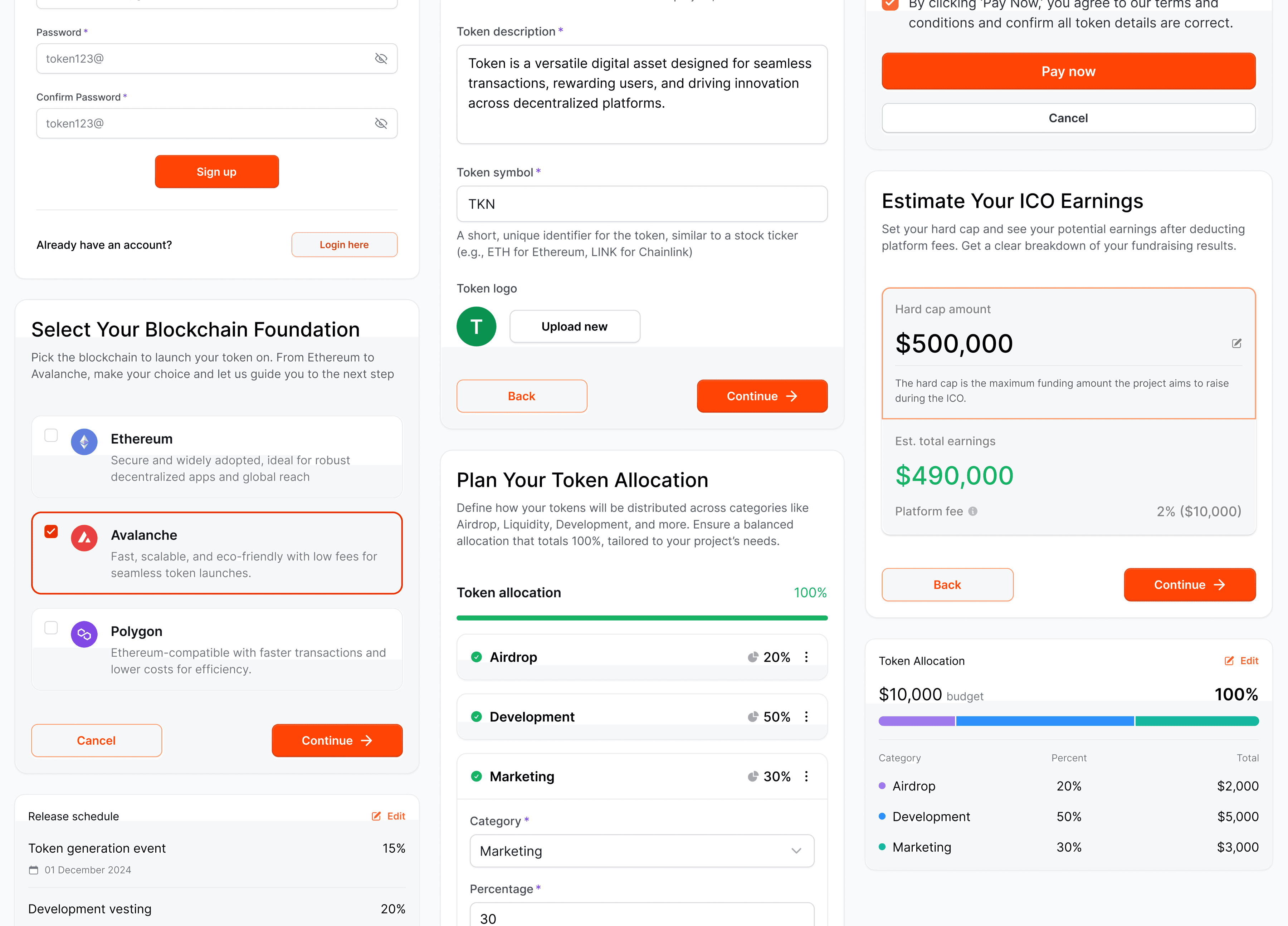 By integrating high-fidelity components and structured user flows, we transformed intricate blockchain processes into a series of clean, step-by-step interfaces. The result is a consistent design ecosystem where creators can navigate through research, application, and launch phases while monitoring critical data—all within a single, unified dashboard.